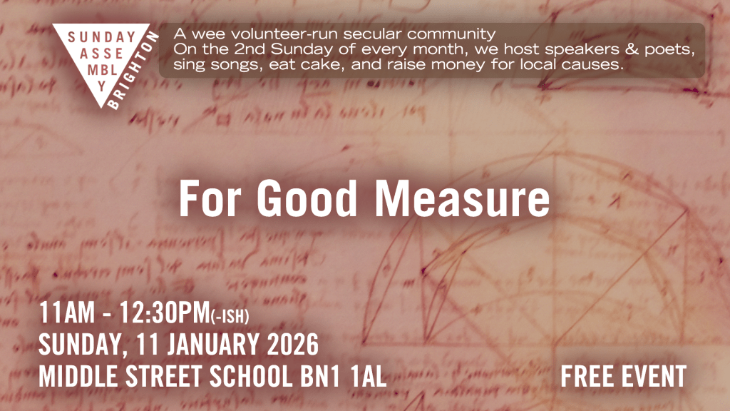 Happy New Year! To welcome in 2026, we’re hoping to bring you an excellent Sunday Assembly For Good Measure! This month, we are bringing one of our lovely science geniuses & longtime friend of Sunday Assembly to our main talk slot! The very excellent Tom Fox will be talking to us about how to visualise the greatness and smallness of our mind boggling universe using the very handy tools of a normal ruler and a cup of tea. We also have our own very helpful community member Lydia talking a little about some interesting musical measures.